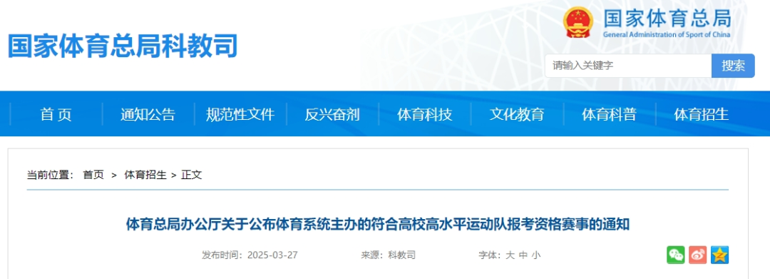 体育总局办公厅关于公布体育系统主办的符合高校高水平运动队报考资格赛事的通知