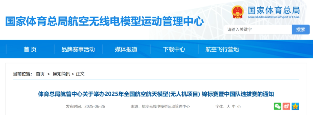 体育总局航管中心关于举办2025年全国航空航天模型(无人机项目) 锦标赛暨中国队选拔赛的通知