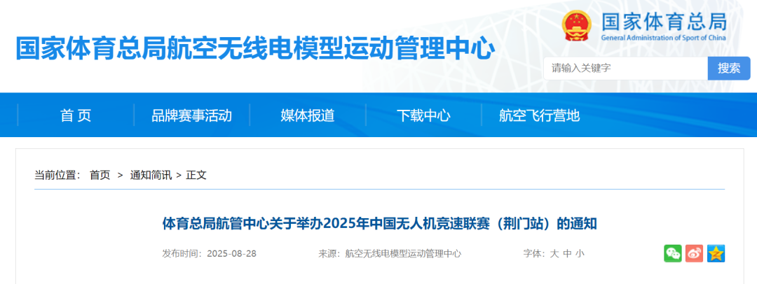 体育总局航管中心关于举办2025年中国无人机竞速联赛(荆门站)的通知