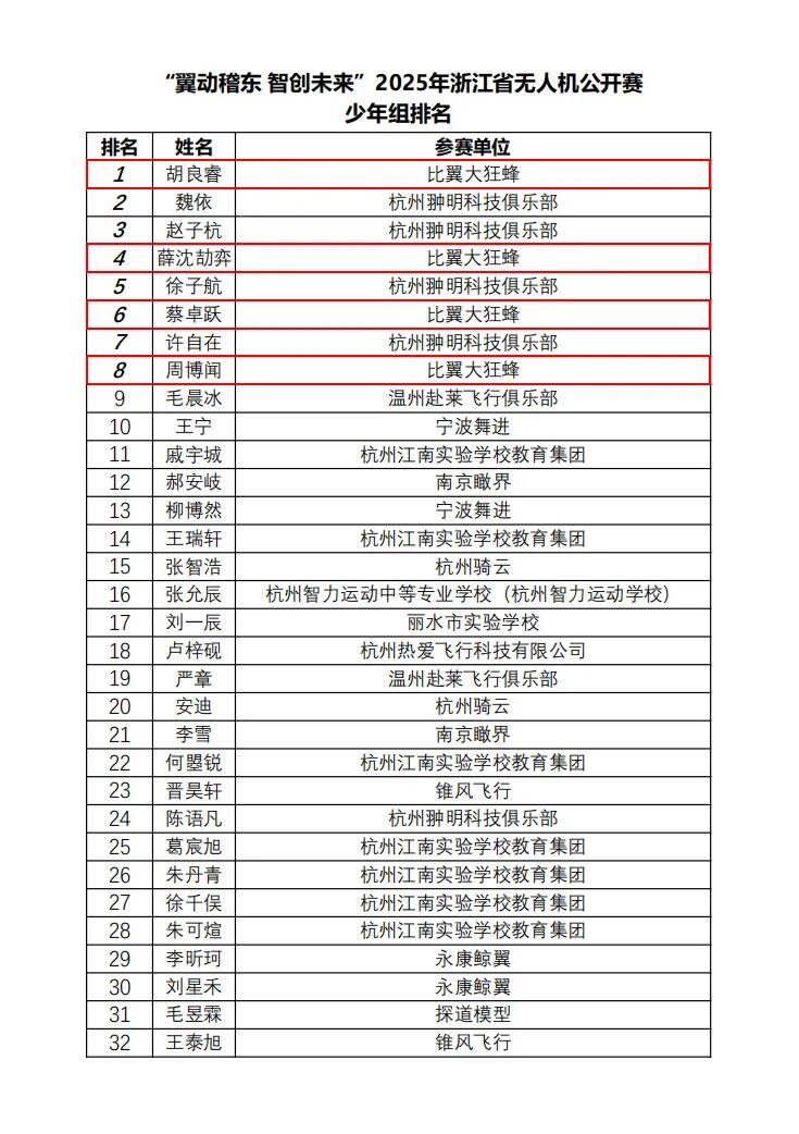比翼大狂蜂俱乐部此次派出六名精英飞手出战,他们分别是:蔡卓跃、钟丽光、薛沈劼弈、胡良睿、王天奇、周博闻。每一位飞手都怀揣着对无人机竞速的热爱与梦想,踏上了这场充满挑战的征程。