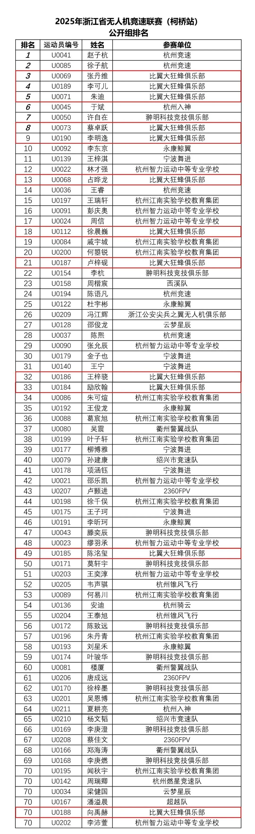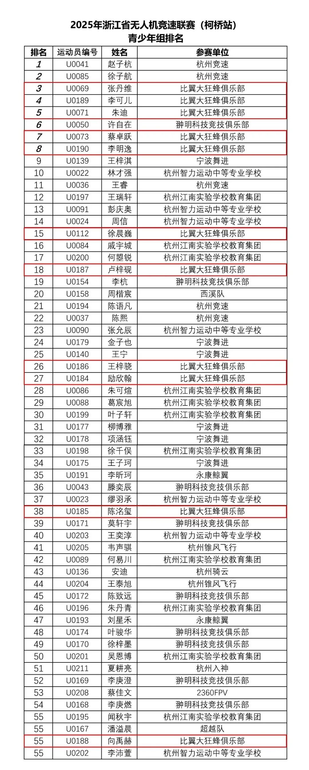 比翼大狂蜂俱乐部此次派出十二名飞手出战,他们分别是:励欣翰、李明逸、徐晨巍、朱迪、占晔龙、陈洺玺、卢梓砚、王梓骁、蔡卓跃、张丹维、李可儿、向禹赫。每一位飞手都怀揣着对无人机竞速的无限热爱与执着梦想,在赛场上全力以赴,展现了高超的技术水平与顽强的拼搏精神。