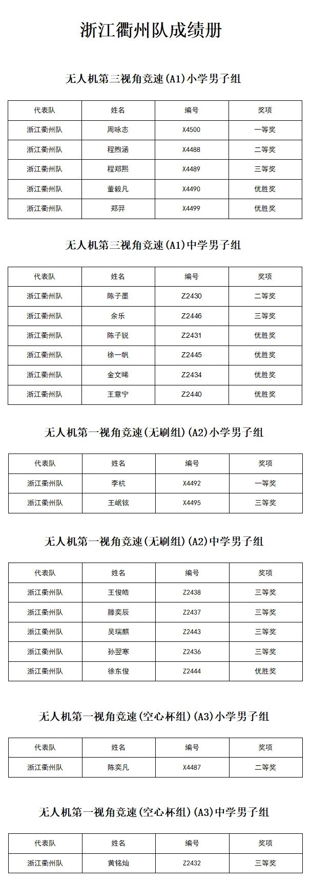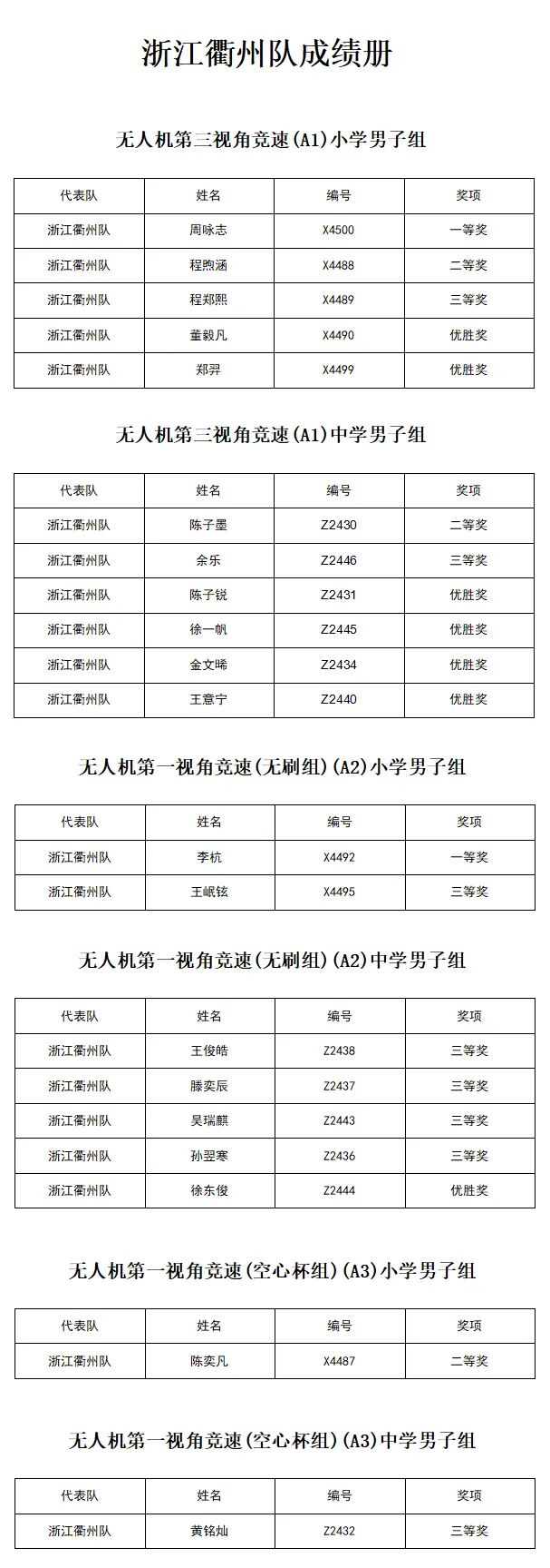 作为首次亮相全国总决赛的新军,衢州队展现了强大的竞技实力和团队协作能力,这次赛事衢州共派出20名运动员参赛,参赛项目为竞速飞行类(A),经过激烈角逐,全队斩获佳绩:一等奖2人次,二等奖3人次,三等奖8人次,优胜奖7人次。充分展现了衢州青少年在科技体育领域的强劲潜力和全面发展的综合素质。