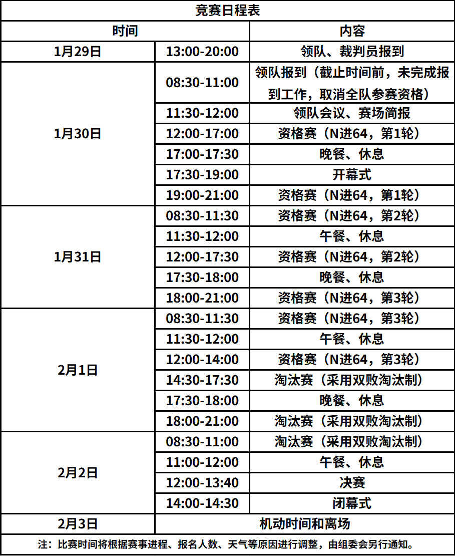 报到时间:2026年1月30日(08:30-11:30),截止时间前,领队未完成报到工作,取消全队参赛资格
